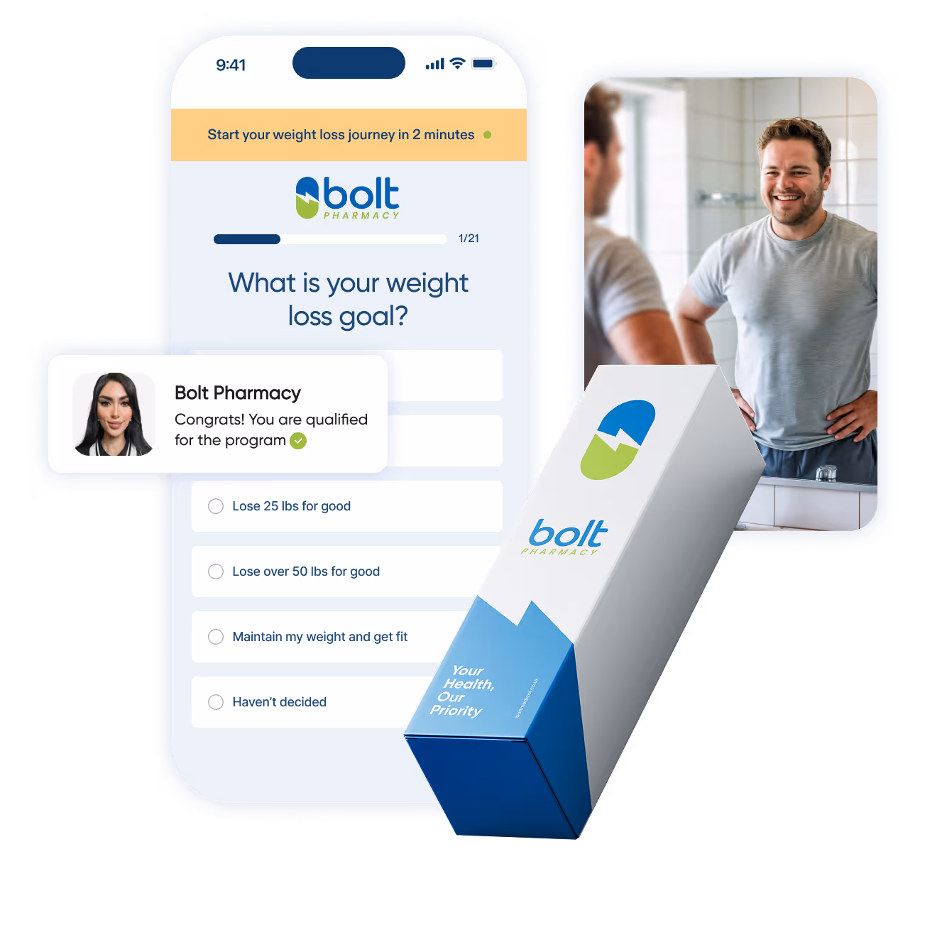 Bolt provides safe, effective GLP-1 medications so you can regain your self-confidence & live life in color. No more going through the day-to-day grayness. This time it’s sustainable.